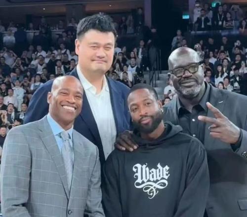 姚明和奥尼尔两位NBA传奇巨星,一起在场边观战。