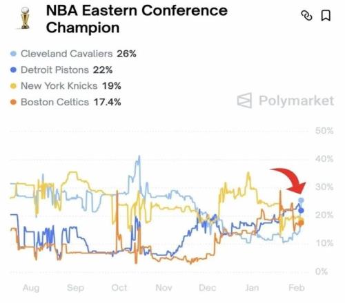 数据网站PolyMarket显示,随着哈登加盟,骑士在东部夺冠的概率从之前的11%飙升至26%,力压目前东部战绩前二的活塞和尼克斯,足见前者的影响力。