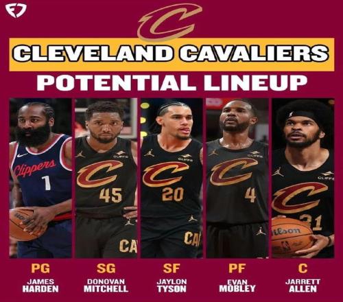 美媒预测骑士接下来的首发阵容,乃哈登+米切尔+杰伦-泰森+莫布里+阿伦。